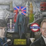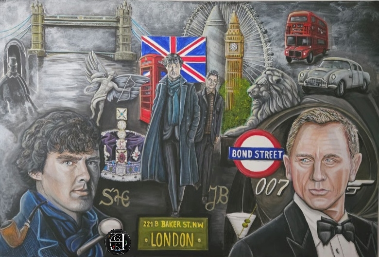 Mit diesem Bild zeigt die Malerin ihre Liebe zur Stadt London und zu ihren Lieblingskrimi- / Action-Helden.
